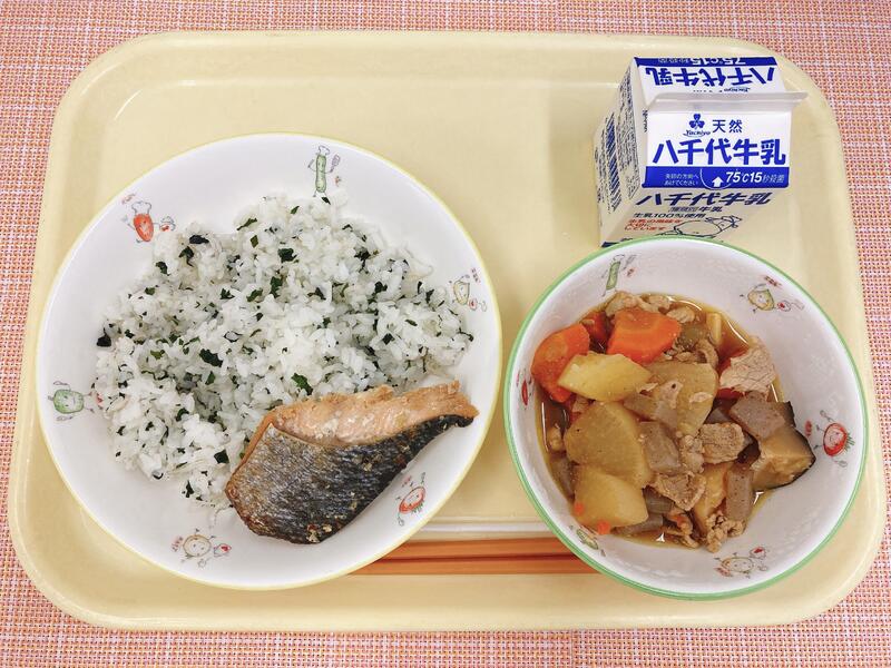 牛乳 しらすわかめご飯 鮭のスタミナ焼き 大根とばら肉の旨煮