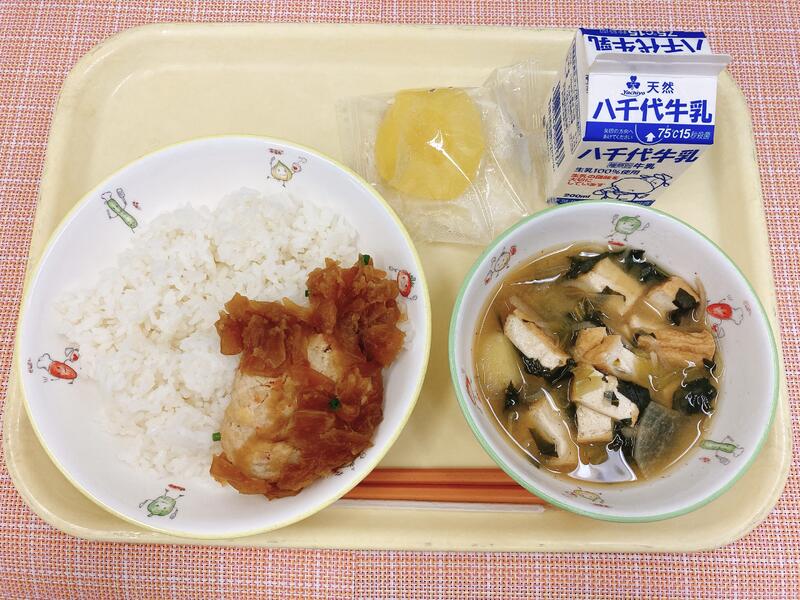 牛乳 ご飯 チキンハンバーグ玉葱ソース 具だくさん味噌汁 冷凍りんご