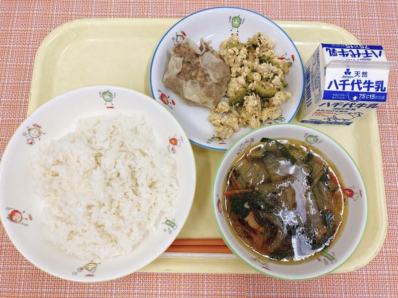 牛乳 ご飯 鰯シュウマイ ゴーヤチャンプル 春雨スープ