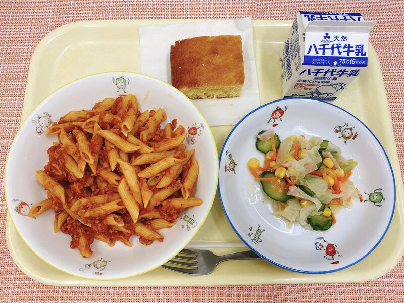 牛乳 ペンネのミートソース キャベツのサラダ ぐりとぐらのカステラ