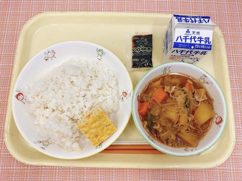 牛乳 ご飯 海苔の佃煮 ぎせい豆腐 肉じゃが