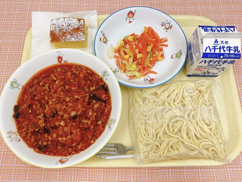 ハート牛乳 スパゲッティ なすのミートソース レモンサラダ 焼きチーズケーキ