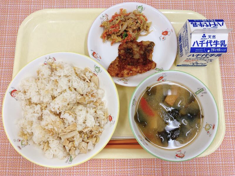 ハート牛乳 ご飯 筍ハンバーグ ひよこ豆のサラダ 大根の味噌汁 柏餅