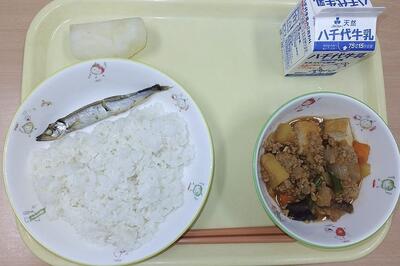 牛乳 ご飯 生揚げの肉みそ煮 焼きししゃも 市川のなし