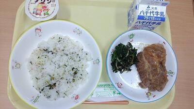 牛乳 菜飯 豚肉の梨ソース のり和え たまごプリン
