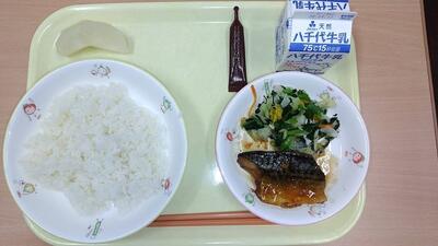 牛乳 ご飯 鯖の甘露煮 菊花和え 市川のなし ミルメーク