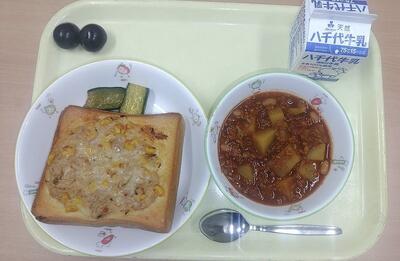 牛乳 ツナコーントースト チリコンカン 中華きゅうり ぶどう