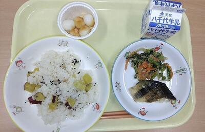 牛乳 さつまいもご飯 ほっけの一夜干し ごま和え 白玉きなこ