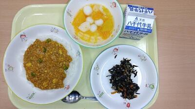 牛乳 ご飯 ふわふわキーマカレー(具) ひじきのマリネ フルーツ白玉