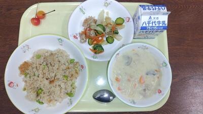 牛乳 枝豆ピラフ マカロニクリーム煮 焼肉サラダ さくらんぼ