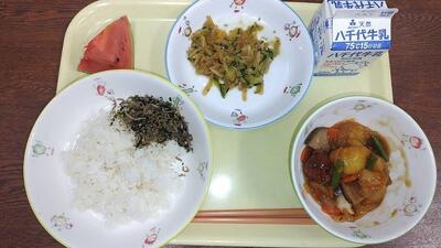 牛乳 ご飯 ひじきのふりかけ 肉団子のうま煮 大根サラダ 小玉すいか