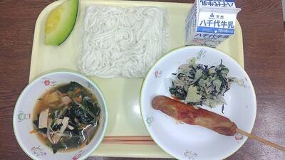 牛乳 うどん 冷やしきつねうどん(具) アメリカンドッグ ひじきとツナのサラダ メロン