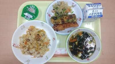 牛乳 キムチご飯 わかめスープ 竹輪の二色揚げ ごしき和え 麦芽ゼリー