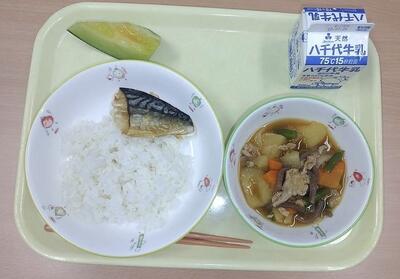 牛乳 ご飯 肉じゃが さばの文化干し メロン
