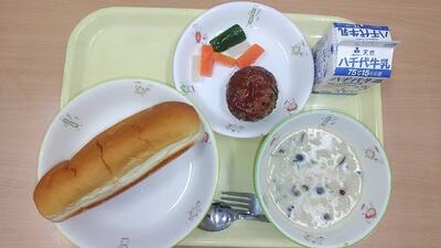 牛乳 さつまいもパン ハンバーグ じゃが芋ときのこのスープ スティックサラダ