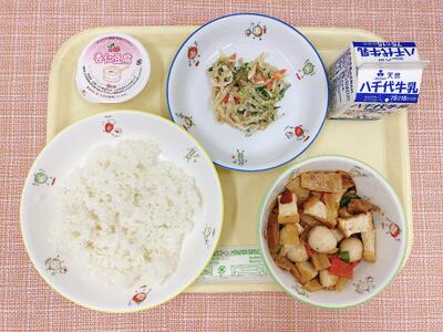 牛乳 ご飯 生揚げの中華炒め バンバンジー 杏仁豆腐