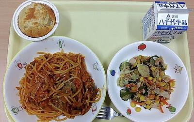 牛乳 ナポリタン 茎わかめツナサラダ 梨のマフィン