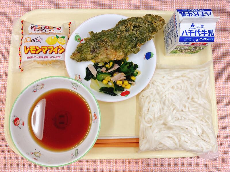 牛乳 冷やしうどん 鯵の磯辺揚げ わかめコーンサラダ レモンマフィン
