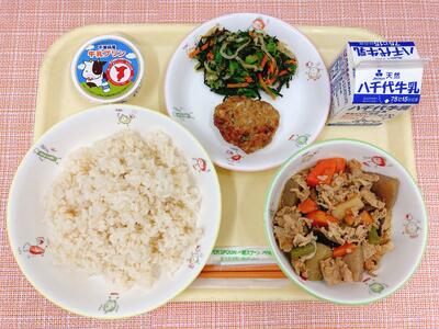 牛乳 新生姜ご飯 さんが焼き 行徳海苔和え 豚肉とごぼうの旨煮 牛乳プリン