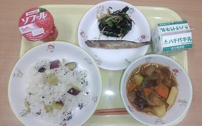 牛乳 さつまいもご飯 くじらの甘辛煮 揚げししゃも 磯香和え いちごヨーグルト