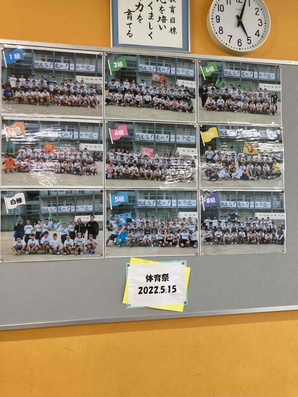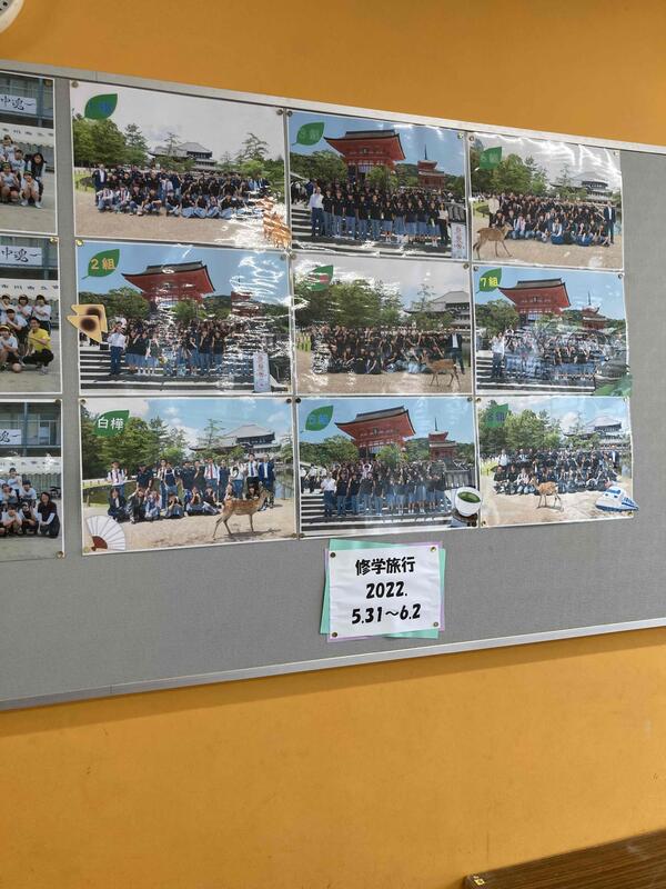 3年昇降口に、体育祭・修学旅行のクラス集合写真が掲示されていました。