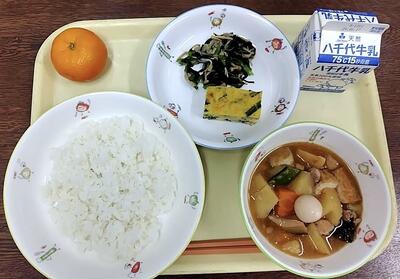 牛乳 ご飯 大根のそぼろ汁 いわしのかば焼き 中華くらげ 冷凍みかん