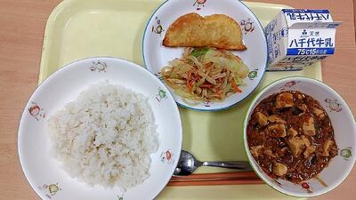 牛乳 ご飯 麻婆豆腐 バンサンスー ぎょうざのアップルパイ