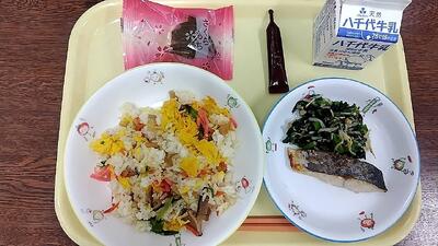 牛乳 五目ちらし寿司 鰆の西京みそ焼き 磯香和え 桜餅 ミルメーク
