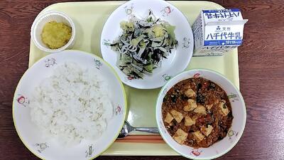 牛乳 ご飯 麻婆豆腐 キャベツひじきサラダ スイートポテト
