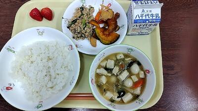 牛乳 ご飯 豆腐の中華煮 スタミナ納豆 野菜チップ いちご