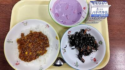 牛乳 ご飯 ドライカレー(ルー) ひじきのマリネ ブルーベリーいちごヨーグルト