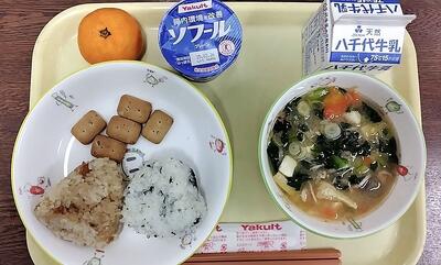 牛乳 おにぎり(茶飯 わかめ) 豚汁 かんぱん ヨーグルト みかん