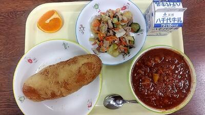牛乳 きなこ揚げパン チリコンカン 焼肉サラダ 清美オレンジ