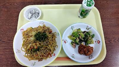 飲むヨーグルト 焼きそば とりの唐揚げ ツナサラダ ガトーショコラ