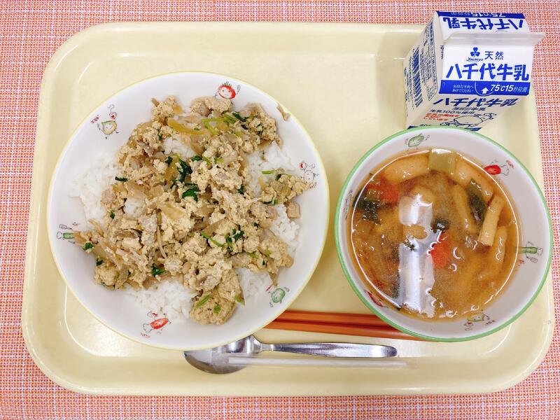 牛乳 三色そぼろご飯 しらすサラダ 根菜汁 オレンジゼリー