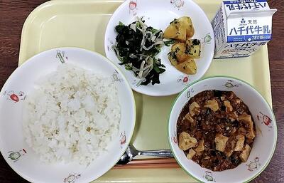 牛乳 ご飯 麻婆豆腐 ナムル みそポテト