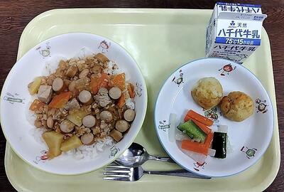 今日の給食ではご飯に乗せて食べます