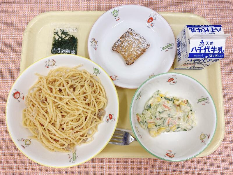 牛乳 たらこスパゲッティー コールスローサラダ アップルパイ