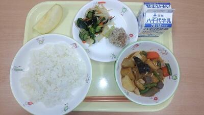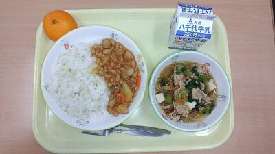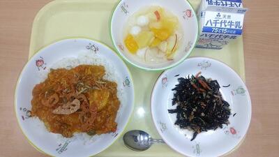 牛乳 ご飯 根菜とひき肉のカレー ひじきのマリネ フルーツ白玉
