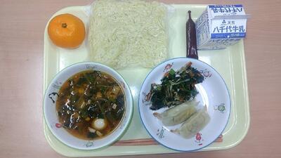 牛乳 中華麺 醤油ラーメン(具) 餃子 梅おかか和え みかん ミルメーク