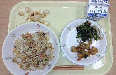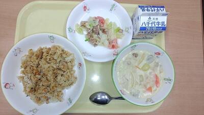 牛乳 キムチご飯 たこ無しじゃがたこ焼き 春雨サラダ ヨーグルト和え