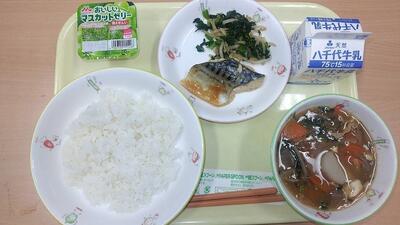 牛乳 ご飯 のっぺい汁 鯖のみそ煮 おかか和え マスカットゼリー