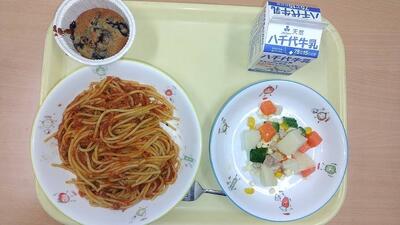牛乳 スパゲッティボロネーゼ マセドアンサラダ 米粉のブルーベリーケーキ