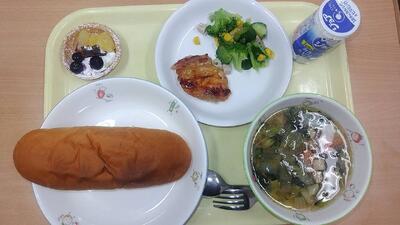 飲むヨーグルト はちみつパン 野菜スープ ローストチキン グリーンサラダ フルーツタルト