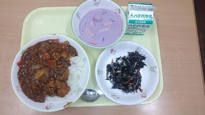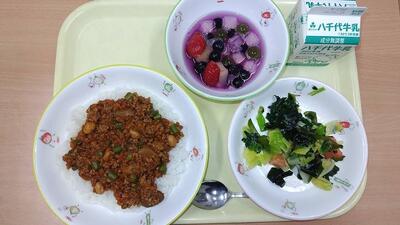 牛乳 ご飯 ハヤシライス(具) ひじきマリネ ブルーベリーいちごヨーグルト