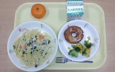 牛乳 きのこクリームスパゲッティ グリーンサラダ オレンジおからドーナツ みかん