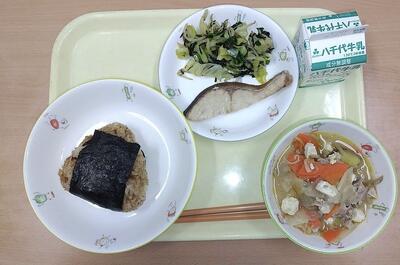 牛乳 おかかおにぎり さつま汁 鮭の塩焼き おひたし