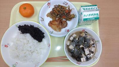 牛乳 ご飯 手作り海苔の佃煮煮 海苔の味噌汁 鶏の照り焼き 五目金平 みかん