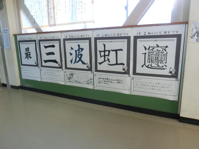 3年生の廊下に、各学級を漢字一文字で表すユニークな取り組みが掲示されていました。