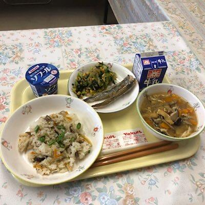 五目ごはん ししゃものから揚げ さつま汁 コーン和え ヨーグルト 牛乳